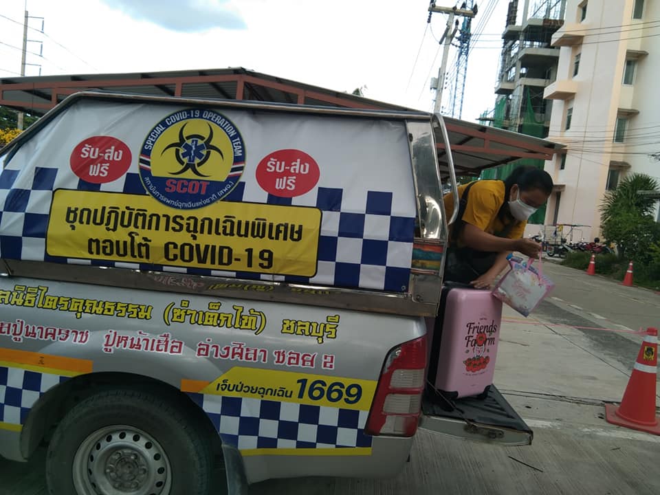 เวลา 07.32 น.บริการรับผู้ป่วนกลุ่มเสี่ยงติดเชื้อ จากหมู่บ้านคาซ่าวิลล์ บริการนำส่งรพ. แหลมฉบัง
